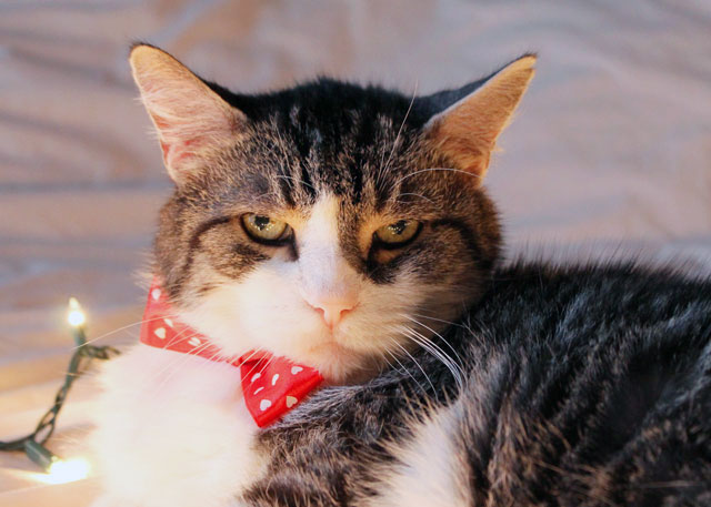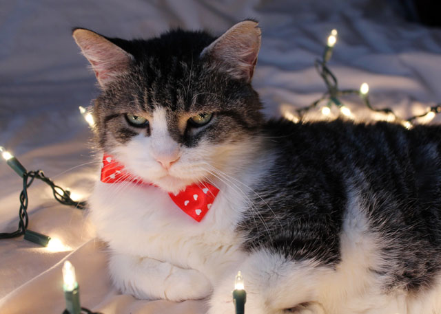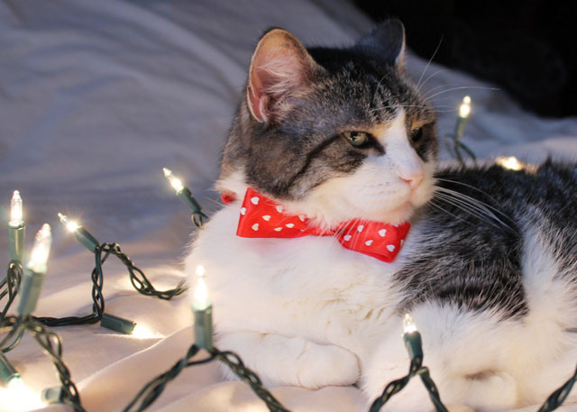Eddie was already relaxing on the white duvet cover, so I tied the bow on with a length of ribbon and set a string of twinkly lights around him. Then all I had to do was snap away, for cat knew exactly what was expected of him. He sure knows how to turn on the cute when he needs to.