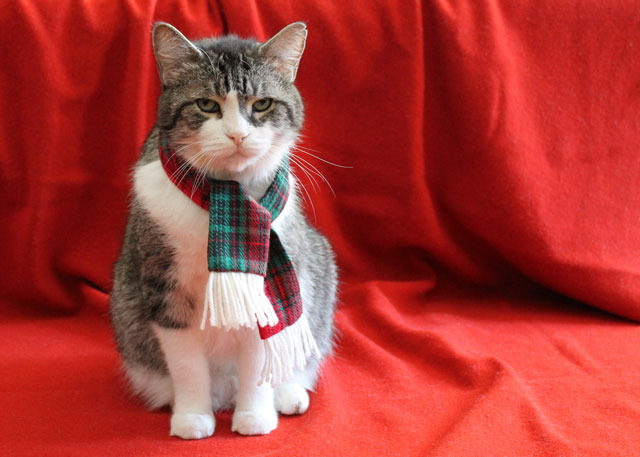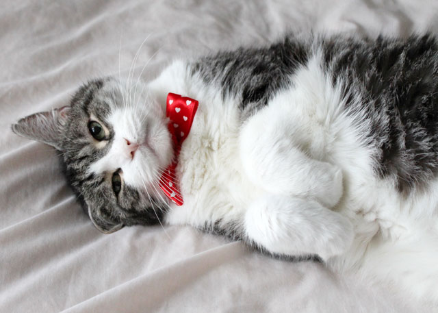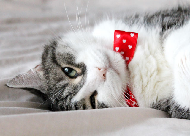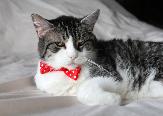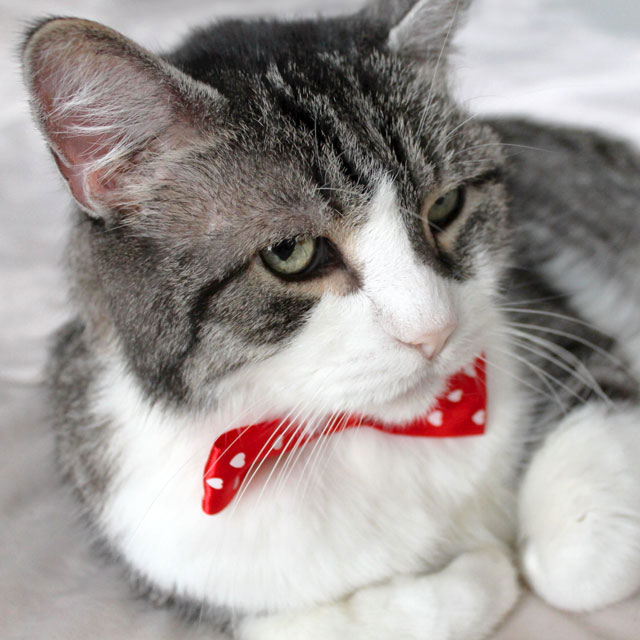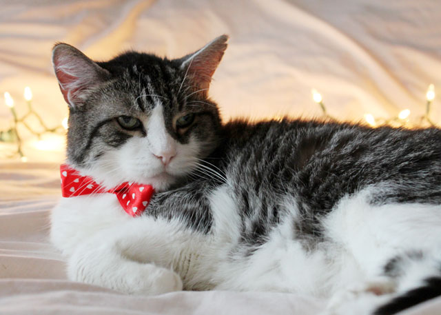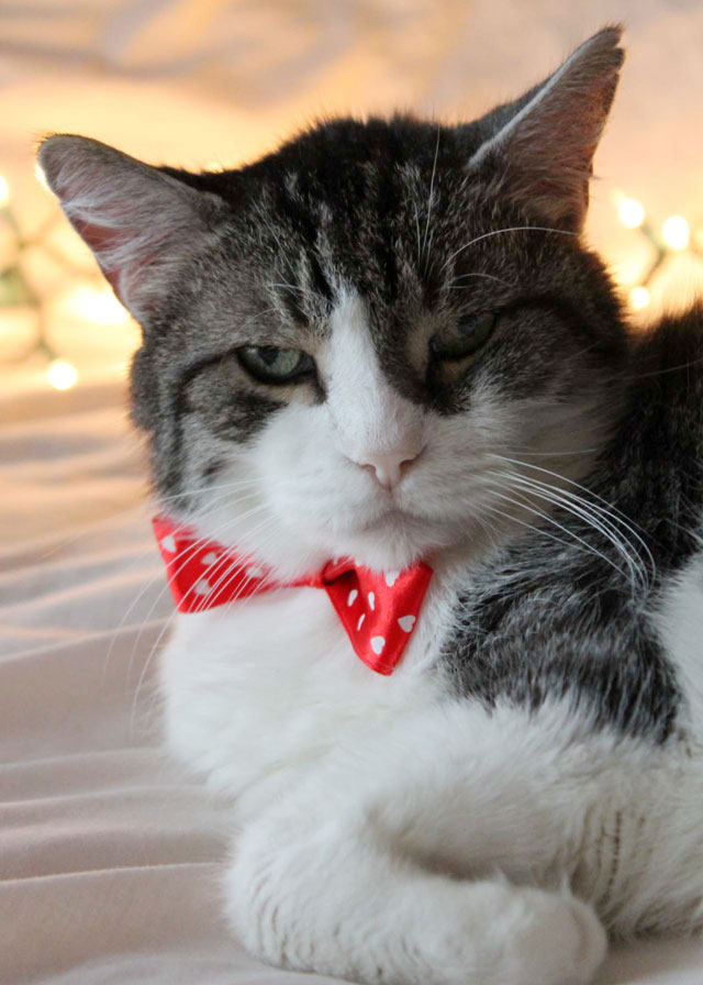 For this year’s Christmas portrait, I quickly made him a snappy bow tie from a short piece of ribbon with hearts on it (that I had been saving for years, just waiting to find a purrfect use for it).