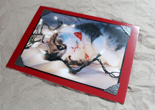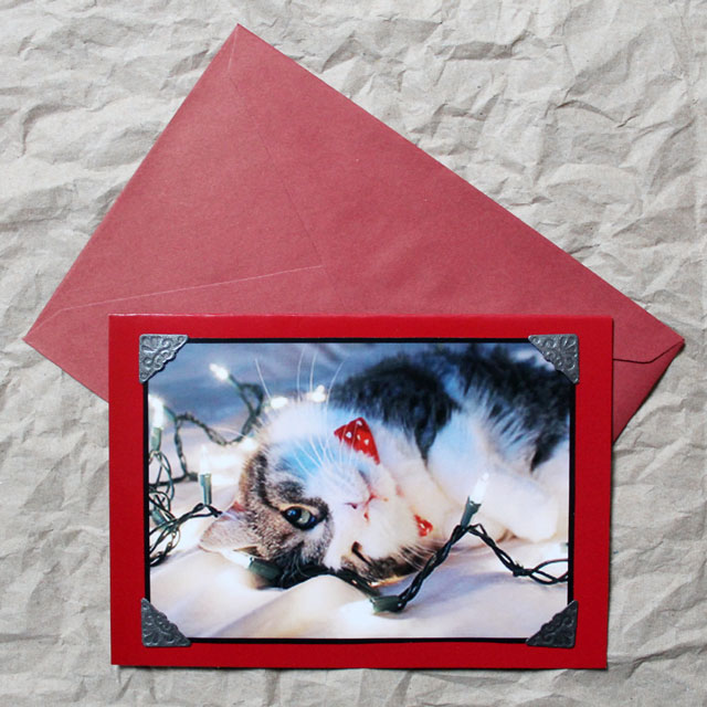 I used the previously explained tutorial (here) to make the cards, except this year, rather than printing the images on our crappy home printer, we saved the digital file of the image on a USB key and brought it over to our local printing shop and had them make colour copies.