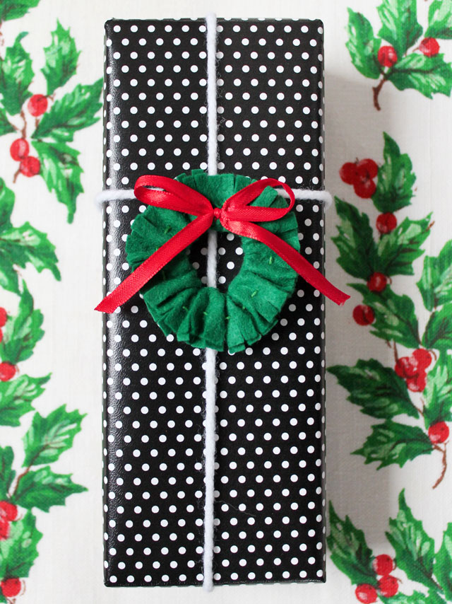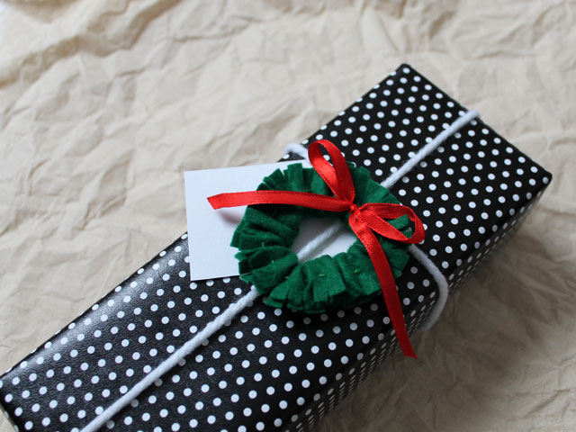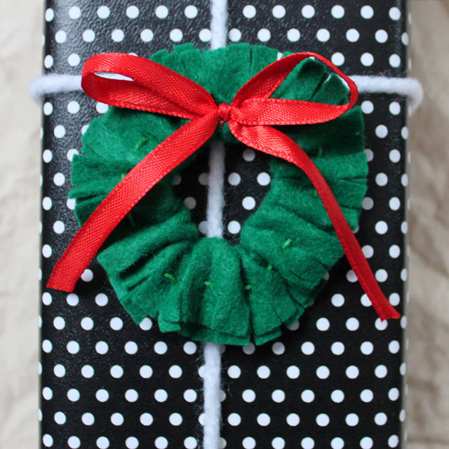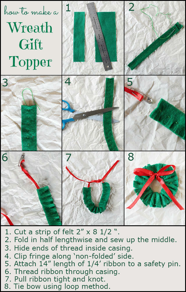 Below is a pictorial of the steps, but I’ll give you an overview here: Cut a piece of felt that’s about 2 inches by 8 1/2. Fold it in half lengthwise, and sew up along the middle. Knot the ends and hide them inside the casing you’ve just made with the sewing. Carefully cut a fringe along the side that is not folded. Each section is about 1/6th inch wide. Really sharp scissors work best for this. (And I can’t stress the ‘carefully’ part enough, because it’s really easy to accidentally cut through your sewing. If you’re making these with a child, you might want to take over the fringe cutting part.) Then attach a 14 inch piece of 1/4 thick ribbon to a safety pin, and use it as a guide to get the ribbon through the casing. Pull the ends tight, to form a ring, and tie a knot. Then tie a bow using the Loop Method, so that both the ends of the ribbon face downward (you may have noticed that when you tie regular bows, one tail goes up and the other goes down, which doesn’t look very good for this purpose.) Finally make a loop to attach the wreath to the gift by using a single stitch to attach a length of embroidery floss, through the back of the wreath so it is hidden.