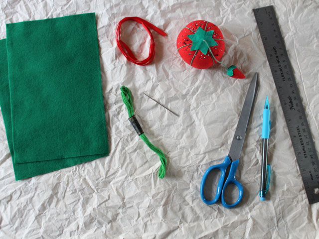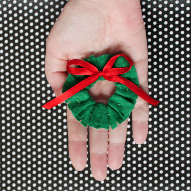 This year I’ve made some small wreaths out of felt and ribbon. While the stitching part can be done on a machine, I didn’t have any green thread, so decided to use embroidery floss and hand sew them, using an easy running stitch. I like how the hand sewing turned out and is probably almost as quick at using a machine. I timed myself and found that it takes about 15 minutes to make one.