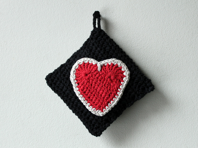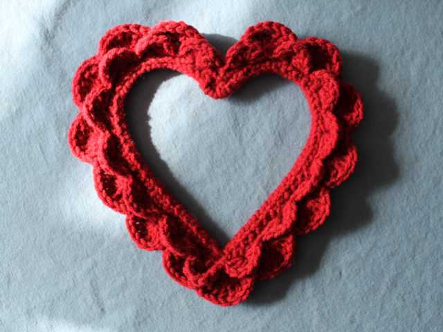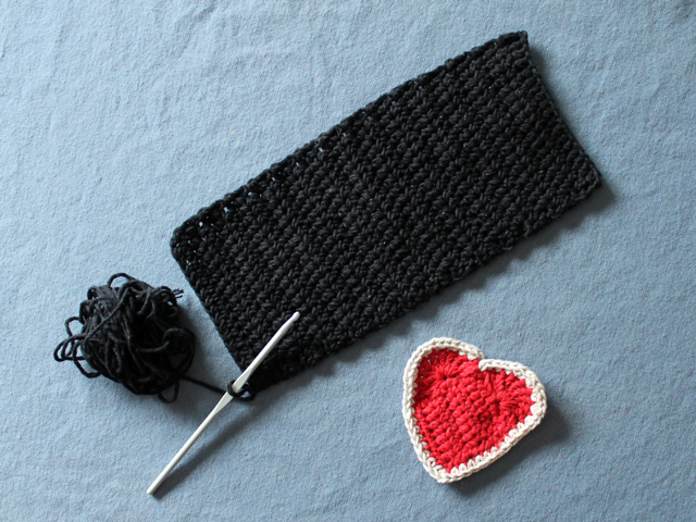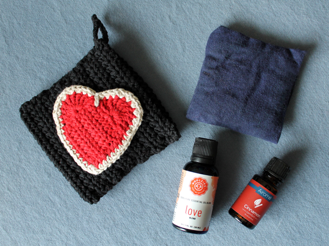This is the 6th one I’ve made and they all get used regularly. Aside from having them around the house, where they add a nice natural scent, I toss one in my suitcase when travelling. Anyway, I wanted one for this time of year, so made a simple (for people who know how to crochet) version using one of these crocheted hearts, which I stitched onto a pouch I made from a length of half-double crochet, sewed down the sides. Non-crocheters can make these, too, using fabric scraps and cotton balls.