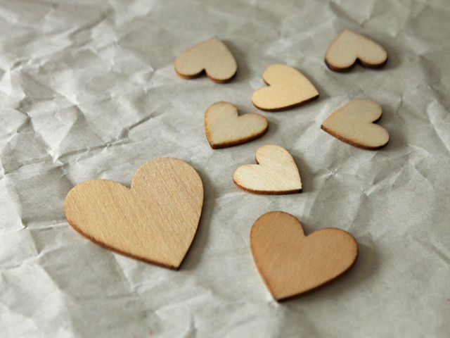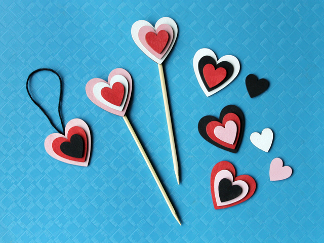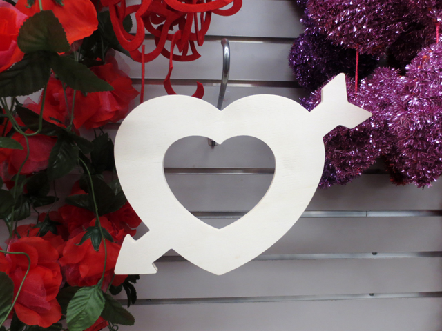 Some small wooden heart die cut decorations, which I painted and glued together, adding skewers to some and hanging strings to others. The supplies all came from Dollarama, found in the regular craft supply section.