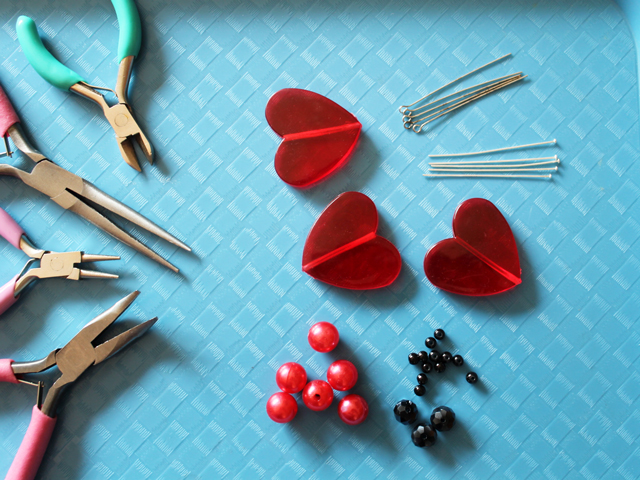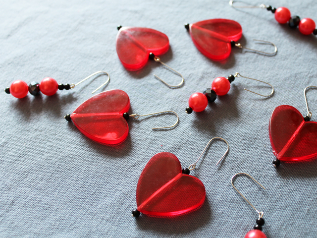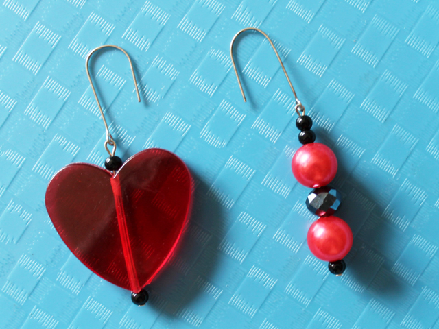 Some beaded Hanging Ornaments, using red beads and plastic hearts from a garland found at Dollarama (which I forgot to photograph before disassembling), and other beads and findings that I had. These beads and hearts were threaded on a tulle ribbon, and with some tugging, I was able to get them off. The beading technique and tools were previously demonstrated in this post.