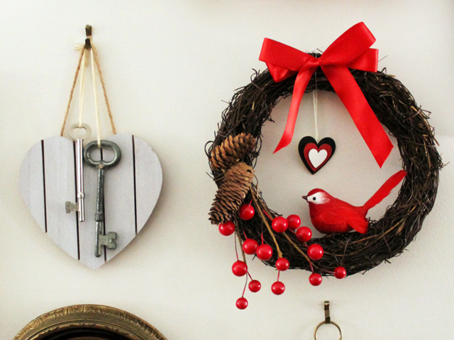 And, here are a couple of things that I slightly modified for the holiday. The hanging wooden heart came with a plain finish which I painted a soft grey. Then I hung it with a couple of vintage skeleton keys that were actually used by our relatives now sadly departed, to give it a “Key to my Heart” look. The big one was from my grandparents and the smaller one from Nick’s aunt.