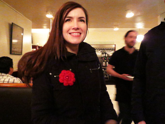 Here she is wearing it shortly after unwrapping it during this double date we had with her and her man Guy.
