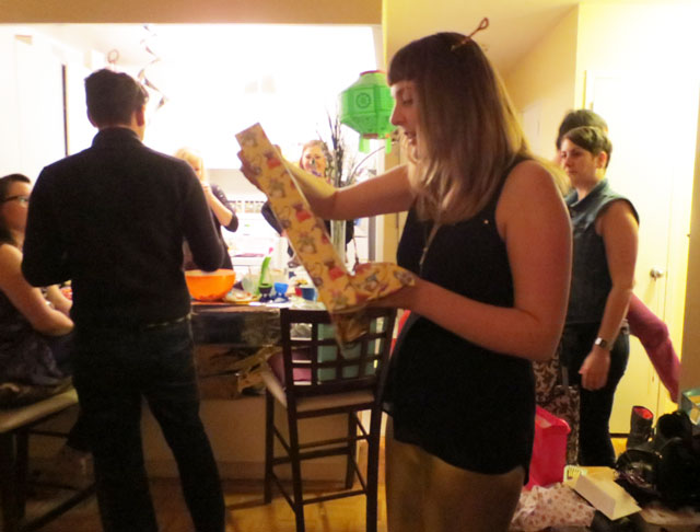 The yellow present with the party hat wrapping paper contains something I made for their daughter, with the yarn I bought during here shopping trip. I’ll show you what it is next week.