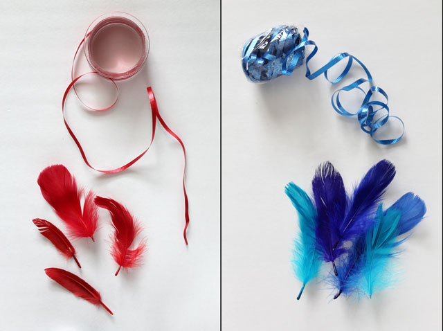 Basically, all you do is gather a few feathers together, tie some ribbon or string tightly around their stems, and curl the ribbon or tie a bow. Note: These might not be suitable for very little children as the feathers can easily be pulled out since they’re not glued in.