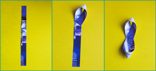 – Try to find a magazine page with interesting and somewhat matching images on both sides of the page. You’ll only need one page per bow.