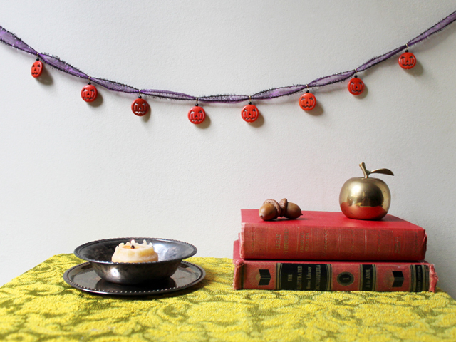 And, of course, the season they are used for is completely up to you, based on how you choose to decorate yours. For the gold one, I used these jack-o-lantern bead pendents made with beads I founds at Michaels, and a bow made from some autumnal ribbon with a gold thread running through it. The black one is decorated with some skeleton beads that came from a Halloween necklace found at Dollarama. It had a large skull at the end of it, which I just cut off (and will be using for another decoration), leaving the beads exactly as they came on the necklace. I just tied a knot and hung them on the wreath, and added a bow made from a sheer purple ribbon edged with sparkly black, but any purple ribbon would work.