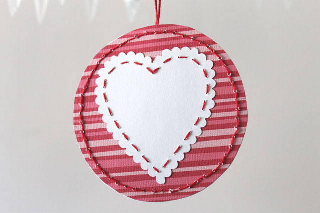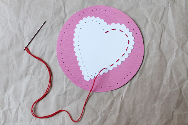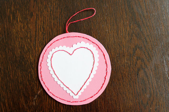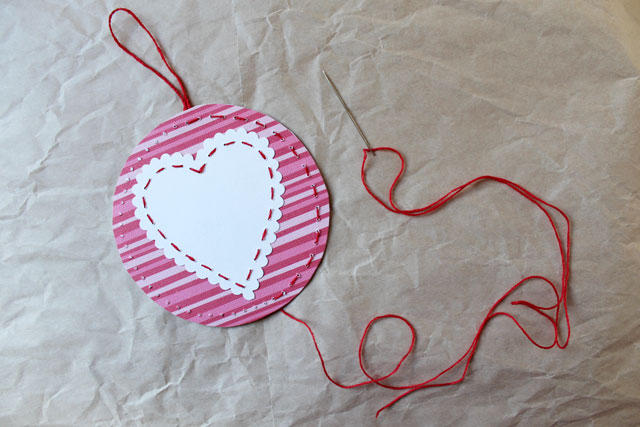(4) Using 3 of the 6 threads that embroidery floss normally comes with, and stitch the hearts to the circles, either by just going in and out to form a dashed line (as I did on the striped side) or in and out, and then going around again, in and out, filling in the spaces to form a solid line (as I did on the solid side). Tie knots at the back of each half.