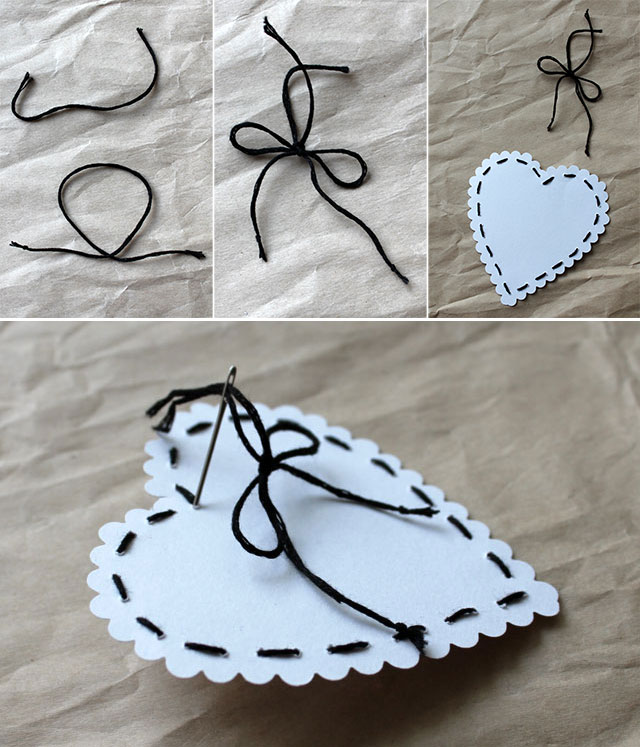 (2) To attach a bow to the front, that hangs better than if you simply tied the ends of your embroidery floss together into a bow, make the bow separately and then attach to your heart. Do this by cutting a length of floss and knotting the ends. Loop it as shown in the photo. Take a second piece of floss and tie it to the loop to make a bow with two tails hanging down. You your needle to attach to your heart. Knot with the threads already on the back of the heart and tape the ends down with regular sticky-tape to make sure they don’t show on your finished piece.