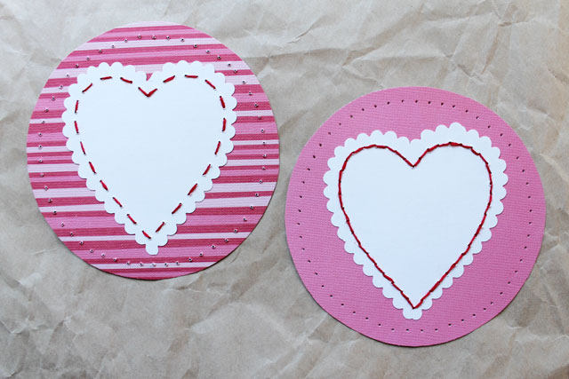 (1) Create a heart shaped template that is slightly smaller than you want your finished heart to be. And cut a circular template the same size at you want your finished card to be. Trace two hearts on the white card stock and the circle on the note card. Cut the hearts out, beyond your pencil mark (as the pencil mark will be the guideline for the stitching part. Use your fancy scissors if using, or plain scissors if not. Cut your two circles out of the note card with your plain scissors by cutting through both layers at the same time (so both circles match perfectly). Don’t separate those circles yet!