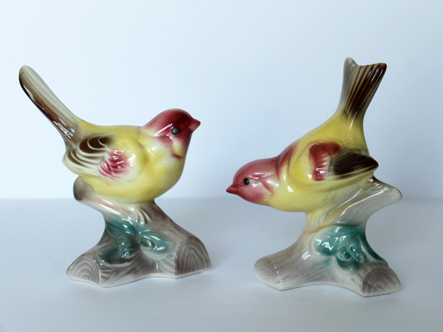 ↑ This pair of birds were made before 1957 by a company called Royal Copley, which was a division of Spaulding China, USA. I didn’t notice while at the store, that one of their tails had broken off and been repaired. But it was very well done, and you can hardly tell. ↑