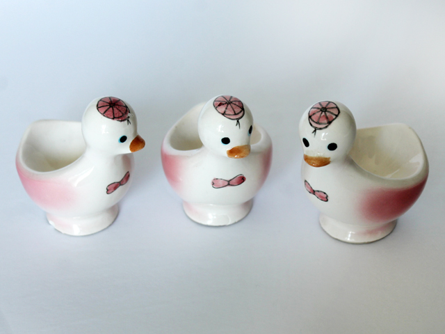 ↑ These three adorable egg-cups were found in a grab-bag hanging on the wall. Unfortunately, being packaged that way, they came with a few minor chips, one of which I was able to repair because the piece was in the bag. Still cute in their slightly damaged glory. You may have noticed them among our Christmas decor, holding some glass Christmas balls instead of eggs. ↑