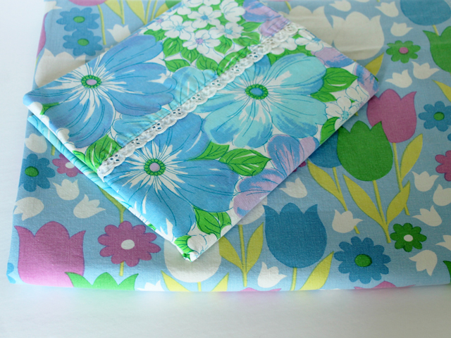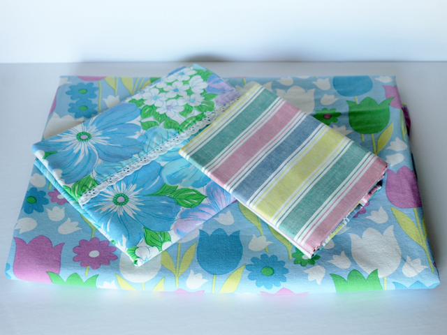 ↑ If I had room to store them, I’d have all the vintage cotton bed linens I could find at the thrift store! But, I’m running out of room, so have to be more picky. That said, this flat twin-sized bed sheet and these three pillow cases, made the cut. They look so cute together! The striped pillow cases were made in Poland, and still have the original stickers on them. ↑