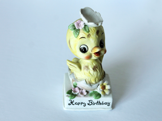 ↑ This bisque “Happy Birthday” chick was made by Josef Originals. He’d be from the 50s sometime. As you can see, a couple of the petals on the flowers are broken off, but that’s totally ok with me. ↑