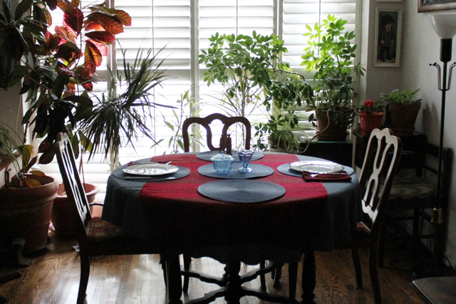 As for the dishes, we just happened to have 4 lime green plates! These were part of a set that I bought myself just after I’d gotten my first apartment after university. The set, coming from the 50s and bought at a vintage shop that used to be on Queen Street West, is a neat one in that the plates are green, the bread plates are yellow, the bowls are a different shade of green, the saucers are burgundy and the cups are yet again a different shade of green. I bought them thinking they would be my everyday dishes, but then I wimped out because I was afraid I’d break them. Now, years later, I’m glad I set them aside and used them with care, because it’s fun to have them to add and accent to table settings. (So instead of using those ones for everyday I bought myself my first set of Corelle dishes … readers will know I’m a bit of a nut for Corelle! And we are still using those dishes too, although a couple have broken along the way.)
