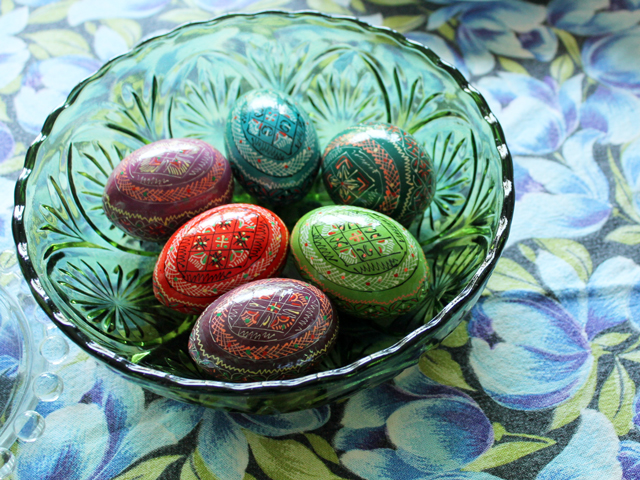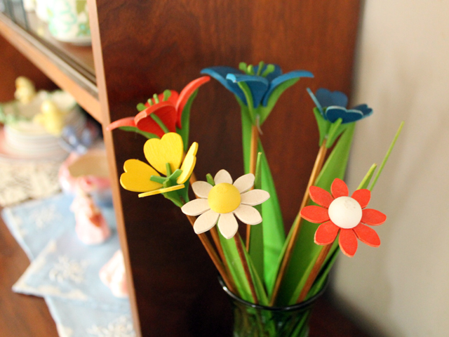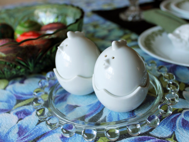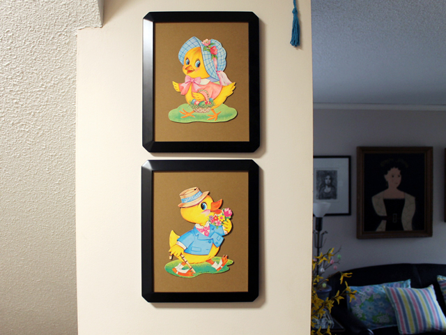 Speaking of being stuck inside, I went ahead and tried to make our place more fun to look at all day long, by putting out some seasonal decorations, including everything I wrote about in the previous post, about the spring and Easter things I’d found at the thrift store during the past year.