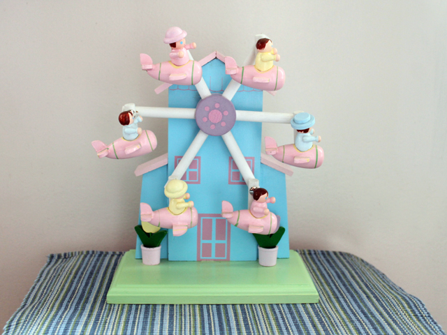 ↑ This handmade wooden piece plays music. It was a gift from my mother years ago. You crank it by turning the wheel, and it plays “It’s a Small World” while the ferris-wheel slowly turns. ↑
