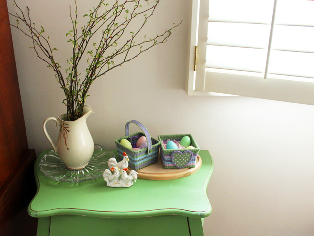 And, here’s where those thrift store finds went, mixed in with other spring-like decor.
