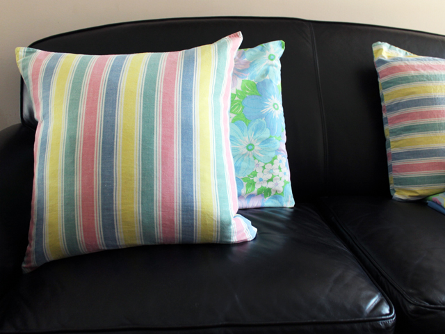↑ I ordered a 20″ plain square pillow insert from Amazon, that fits perfectly inside regular pillow-cases. When you fold the extra fabric inside, it looks just like a regular cushion, but with an easy change (and washable) cover. ↑