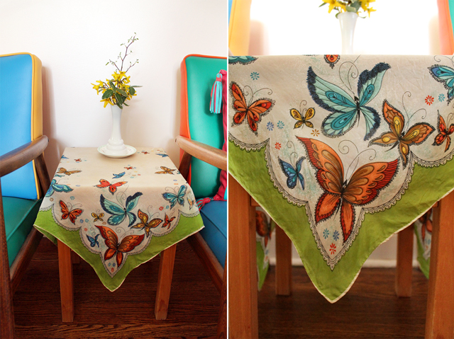 ↑ I won’t be wearing this vintage butterfly scarf outdoors anytime soon, so might as well use it as a tablecloth! ↑