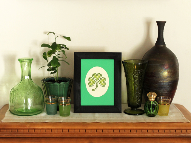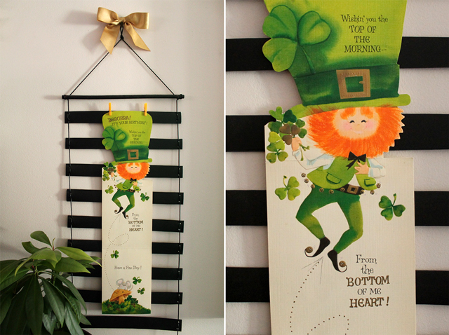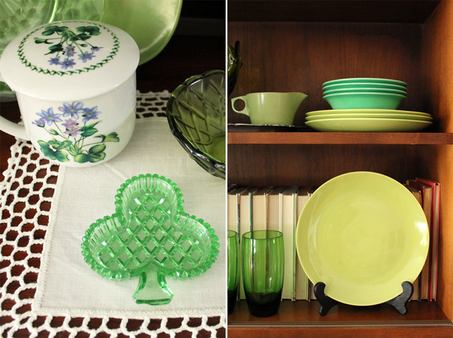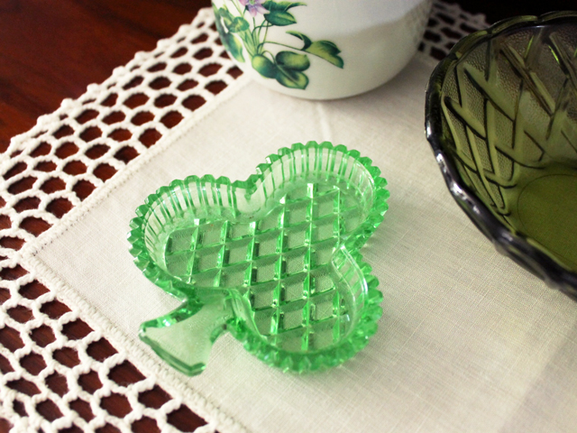 ↑ This clover dish was one of a set of four playing card suits I found at the thrift store, with a club, heart, spade and diamond, previously described in detail in this post. I used the pink heart from the same set in our Valentine’s decorating.↑