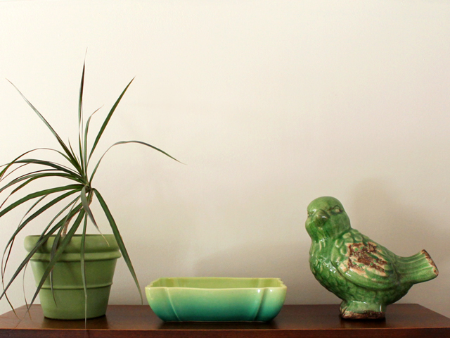 ↑ The bird is the only thing featured in this entire post that I purchased in a regular retail shop, a home decor boutique on Queen Street West. While I prefer vintage everything, that’s not to say that I don’t also buy things at retail, because I do, aiming for quality independently made items whenever possible. But, apparently I’ve bought no other green things! ↑