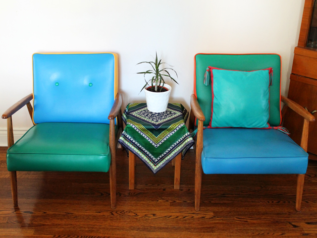 Across from that scene, are a couple of chairs that everyone sits in when they visit. They are vintage frames that were covered in new-vintage vinyl by a local artisan. Funny fact, I very rarely go to casinos but these were purchased with winnings from a slot machine. I won $1,000 one time!