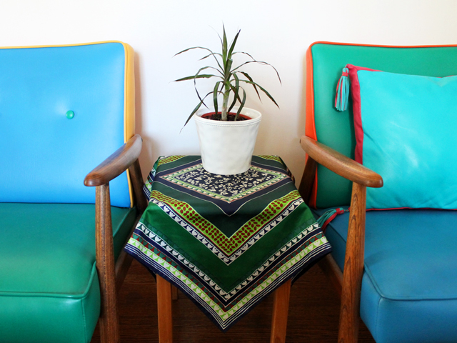 ↑ The little table was another curbside free find. The vintage scarf / table cloth came from a shop in Kensington Market. The leather pillow was thrifted, seen in this post. The plant is a cutting from the top of one that had grown right up to the ceiling. It grew so tall that it was bending. So, I cut the top off, rooted it in a jar of water, and potted it up. So far, so good. ↑