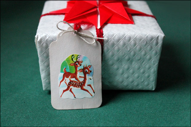 I reused the laminated tags I made and posted about a couple of years ago here. They’re very handy and I love anything that can be reused. (This year I finally forced myself to toss to recycling, the smaller, worn out pieces of gift wrap that we’ve been using for one another year after year. But honestly, it was hard to do, because with the years of use, come years of memories attached. But it was time!)