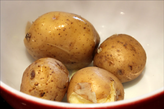 One potato per person being served. Leaving the skin on new potatoes is fine. Keep in mind that leftovers heat up nicely, so you might want to throw a couple of extra spuds into the pot.