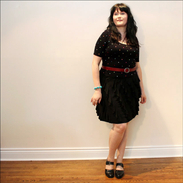 For this outfit I added some colour with a little polka-dotted sweater I've had for a while. I love the jewel-tones of the embroidered dots! Then, after trying on a couple of different black belts, I found this red one that I had forgotten I had. For jewellery I went with a vintage Avon fake turquoise bracelet. I was also wearing real turquoise earrings which were round and the exact same size as the dots on my top, but they didn't show up in any of the outfit pictures. Also not pictured was my purse, which was this red Kenneth Cole one. That little bag sure got lots of complements, especially when I pulled my camera out of it!