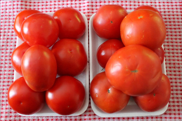 To make homemade tomato sauce: Chop a whole lot of fresh tomatoes -- don't worry about pealing them, unless you really want to. If you do want to peel them, cut a shallow slit in each one and then drop into boiling water for about 30 seconds. Run under cold water and the peels should comr right off -- some onion, peppers and garlic, quantities dependent on your personal preference.Sauté the onion, peppers and garlic in olive oil. Then add chopped tomatoes and their juices. Add a bit of salt (around 1 teaspoon).Cook at a low simmer for at least an hour, until your sauce has reached your desired thickness. Taste and add more salt if desired. Stir in a bit at a time and keep tasting, so you don't end up over-salting. You want it to remain slightly sweet because you can always add more salt or salty ingredients when you prepare your final dish.We cook ours until it is reduced by a third in volume. It is still pretty liquidy, but will thicken when it cools. Also, when a thicker, more dry, sauce to make pizza is needed, we further reduce it.If you prefer a smoother sauce you can use an immersion blender, food processor or blender at this point.Let your sauce cool completely and divide into serving sizes containers, 1 to 2 cups per. Freeze and then pull it out when you need it. Note that there is some seasoning in the sauce but when you use it you will add more based on what you're making with it.