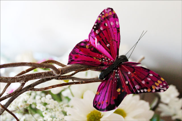 Secondly, my sweet parents-in-law sent me this cheerful basket of flowers, that was decorated with butterflies made from feathers. So lovely.