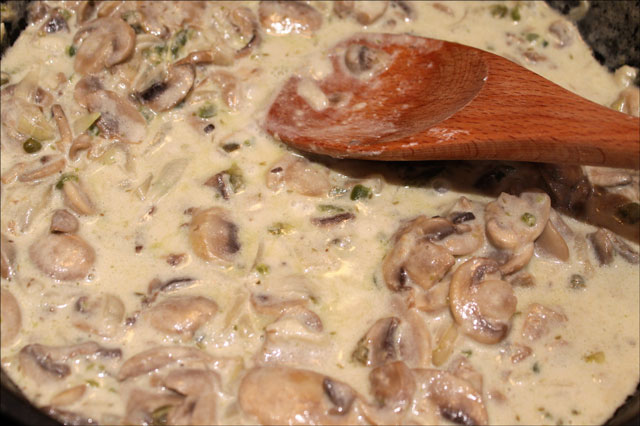 Saute some chopped onion, minced garlic and sliced mushrooms in olive oil. Add some salt ... notice how the addition of salt caused the vegetables to release liquid and for the mixture to turn into a more saucy consistency? Add some hot pepper flakes if you like some heat. Add some chopped capers if you have/like them. Romove from heat and stir in some cold water (about 1/4 cup). That's to cool it down so it's not too hot when you add the dairy products. And guess what? ... there isn't actually any cream in this sauce. Well, there is sour cream, so go ahead and add a few tablespoons and stir it around. The low-fat stuff is just fine to use here. We also added a bit of goat's cheese, so if you have some, put it in, or if you have some plain cream cheese, go ahead (again, lower fat type is fine). Finally, thin out the sauce with a drizzle of milk and/or white wine if need be. Return to low heat to bring to serving temperature, but make sure it doesn't boil, as the dairy products might separate.