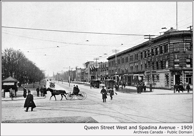 I do like to examine historic photographs and compare the spots they were taken to today. Here are some taken from the same spot at Queen Street West and Spadina Avenue, with the old one having been shot in 1909 and the new one taken last week! What a difference a century makes ... or not. That building looks barely touched by time, though the houses behind it (to the north) were replaced by that other old looking building. I wonder when that happened.