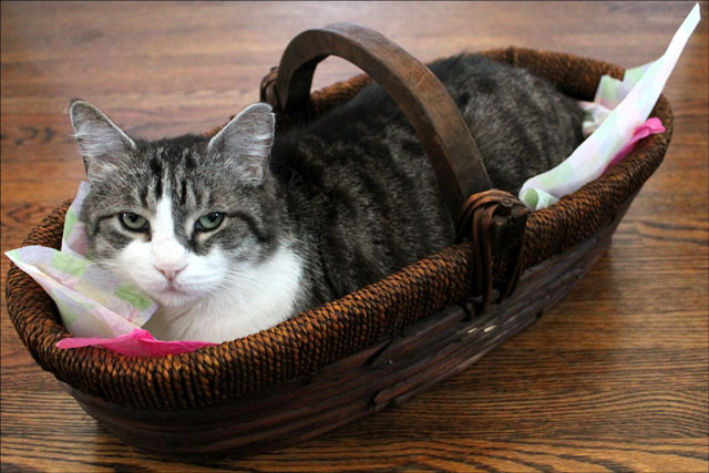 My cat Eddie is really into finding new places to hang out, so when I put this basket on the floor, he just jumped right in and made himself comfortable. He's my funny bunny Easter Cat!