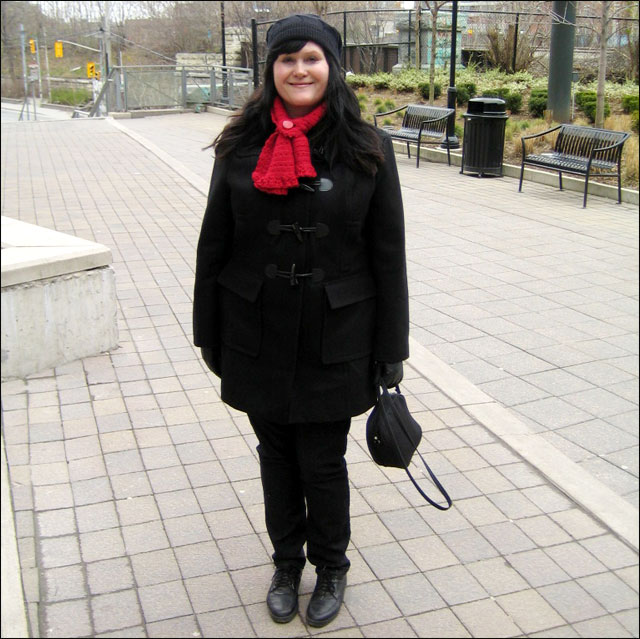 This is an impromptu post inspired by a few minutes of grabbing my ipad and sitting in a sunbeam with my coffee this morning. My favourite fashion blog, (aside from that of my online-friend Style Marmalade) is The Sartorialist. I'm sure many of you also love this blog, where a photographer with a fantastic eye for style, takes pictures of everyday people out on the streets of a wide range of cities. His photography is great and I really like to see what real people are wearing when they're out and about.But his post from yesterday afternoon particularly caught my eye. Why? Because the photo is of a pretty girl in Paris who is wearing almost the same outfit I wore the other day when I wore the new scarf I made and my new(ish) coat, seen here. Her scarf is bigger but the same colour as mine and we're both wearing a hooded duffle coat with toggles.