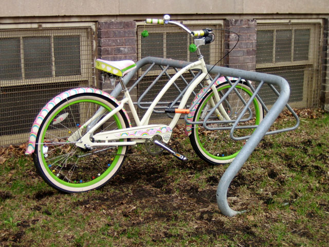 My post features this happy bicycle I saw the other day. I love being in the midst of someone who would have such a bike! Its rainbow fenders and heart seat were such a cheerful sight, not to mention the dangling green pom-poms on its handlebars!