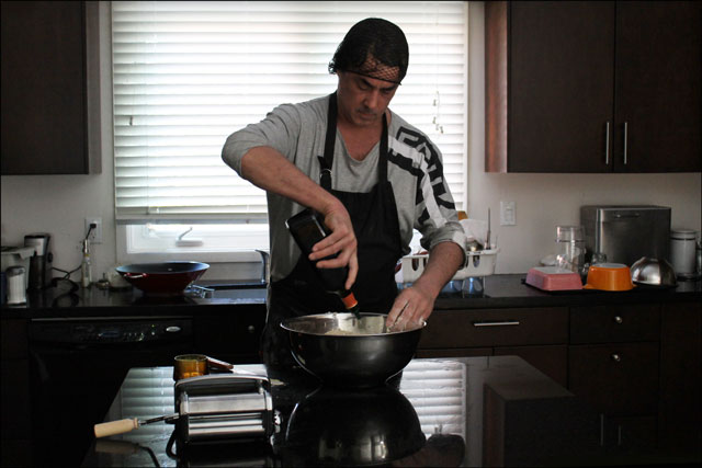 Note: He doesn't have some weird new hair-do ... he is wearing a hairnet in these pictures, which he automatically always does when he's cooking. A holdover from days spent working in a restaurant kitchen.