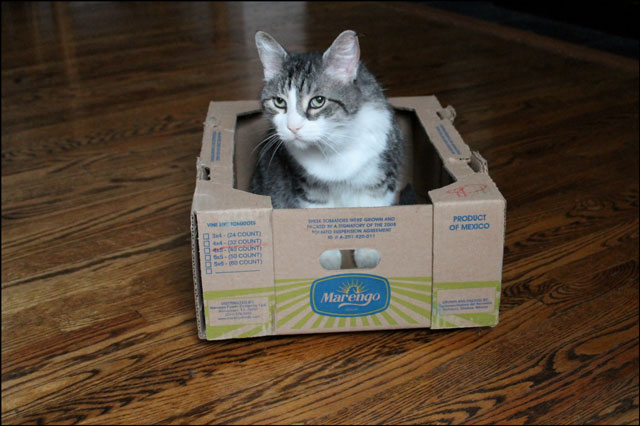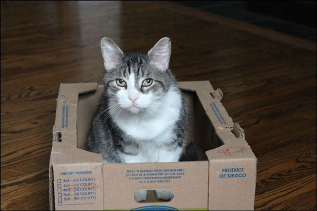 And at check-out time you pack your things into whatever shipping boxes they have available that day. So, the last time Nick went he came home with a load of groceries for us, and some nice tomato boxes for Eddie the cat.
