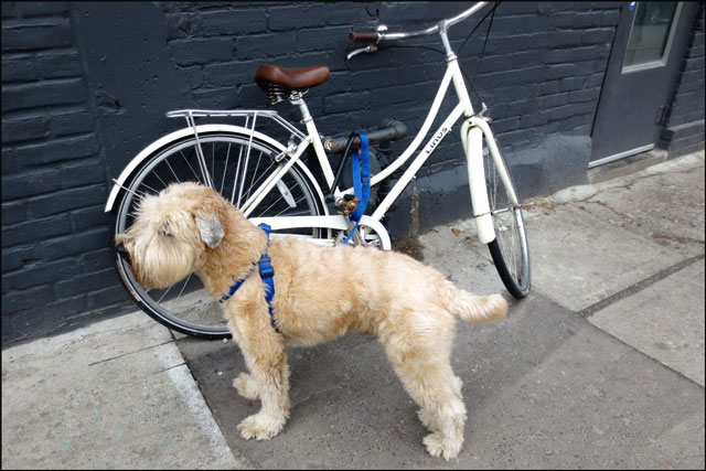 Instead of pictures of Eddie the Cat today I thought you would like a look at this cute boy who I met the other day while I was out walking around. He was patiently waiting for his person, who was probably inside the nearby pizza place getting some dinner. I'm pretty sure he is a Bouvier, and being so means he'll get a lot bigger.