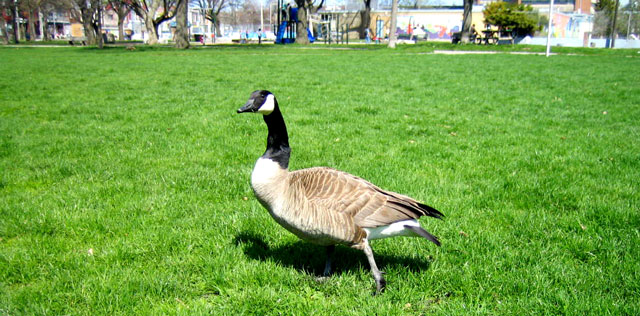 Then we came upon this goose in the park. Now geese in Toronto are not that rare of a sight, however I've passed through this park many many times before and have never seen one here. It's quite a ways from the waterfront where one would commonly see (and complain about the mess left by) these birds. He/she was all on their own so must have somehow gotten separated from the flock. One could say that the others all flocked off.