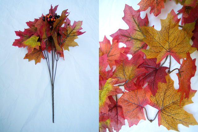 I wanted to use coloured maple leaves for this project but using real ones was out of the question, as they would just dry up and break off. Take this from someone who helped clean up after a certain Hallowe'en party where real leaves were scattered on the carpet! It looked great and was a terrific party, but, oh the mess it left behind!