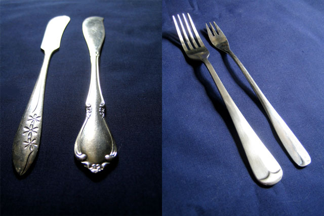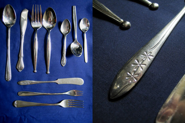 Last time I visited my parents in the small-ish city where they live, my mother and I spent an afternoon at the Thrift Stores to see what treasures we could find. At the Goodwill I came upon two heaping trays filled with mismatched cutlery pieces. A quick look turned up some unattractive forks with bent tines and plenty of scratched up spoons. When did they make cutlery with plastic handles?!