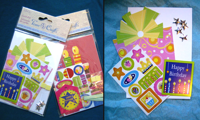 Since my usual supplies were blocked from access, I grabbed a couple of card-making kits from the store. This type of pre-packaged assortment of goodies was new to me, each containing everything you needed to make two greeting cards, including the envelopes. Not as down-and-dirty-hand-made as I usually try for, but they looked pretty good, for sure. I laughed at the little slogan on the back of the package ... "No skills required".