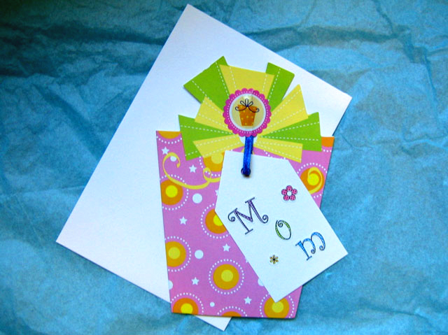 For my mother's card, I went with the the pinky colour combo pack, on the left. But I wanted to personalize things a bit more, so I grabbed a piece of blank business card stock, trimmed it to a point and punched a hole into it, to make the semblance of a tag. I was able to snake my hand into the forbidden craft supply drawer and get the top thing out, which was a sheet of letter stickers, which I used to write MOM on the tag. I attached it with that blue "keep-your-blouse-on-the-hangar" ribbon, (mentioned in yesterday's gift wrapping post), so the tag could dangle and move. Then I stuck the card printed with Happy Birthday inside, and hand wrote my personal greeting below it.