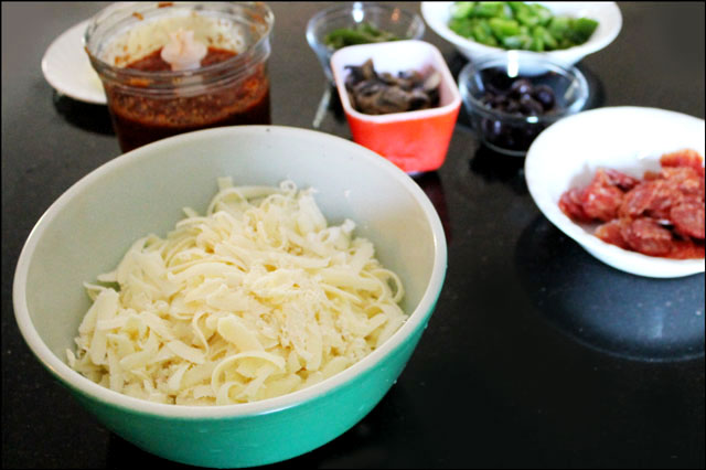 He used the Bread-maker to make the dough but you can make your pizza dough by hand or buy it fresh/raw in the bakery section of your grocery store.